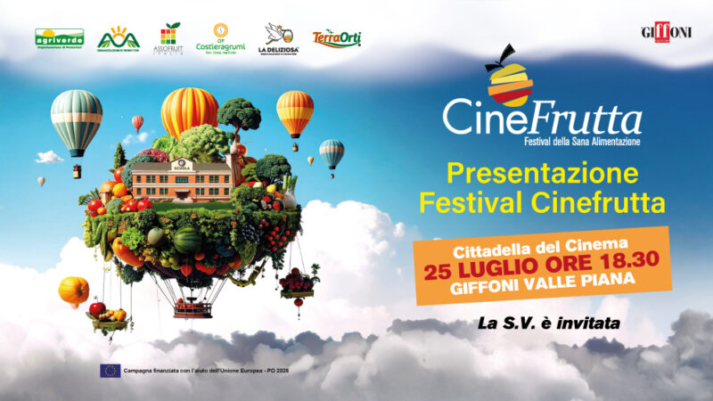Venerdì 25 luglio 2025, alle ore 18:30, presso la cittadella del cinema di Giffoni Valle Piana (SA), in occasione della 55esima edizione del prestigioso Giffoni Film Festival, verrà ufficialmente presentata la tredicesima edizione di Cinefrutta, il ‘Festival della buona alimentazione, originale concorso per cortometraggi dedicato alla promozione della sana alimentazione tra i più giovani.